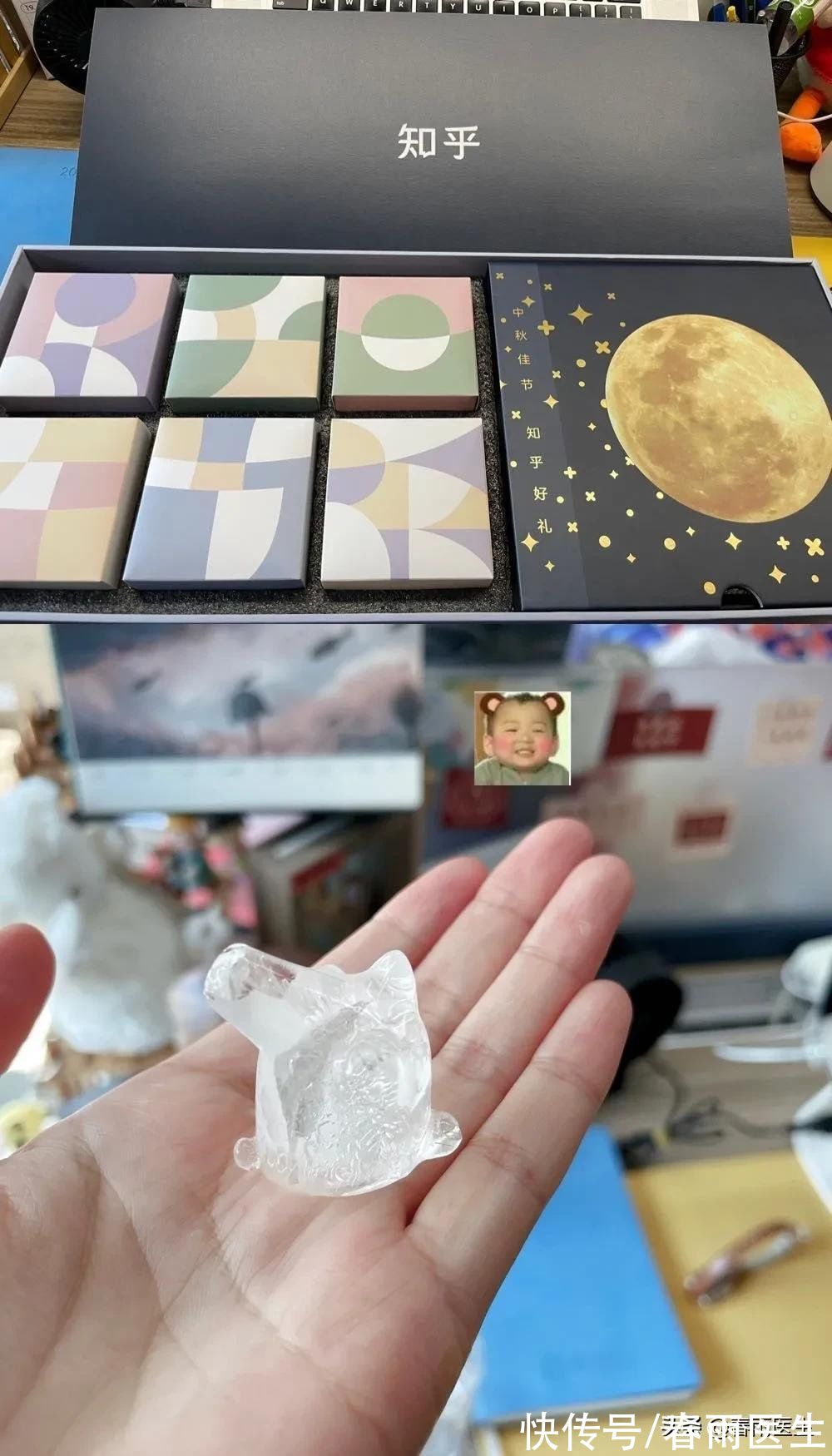 几天前春雨君收到知乎月饼礼盒的时候,惊呆了。包装和月饼都很漂亮。刘侃山还有一个可以冻出来的模具。同事我们把它们分到一起,最后留下一个吃。